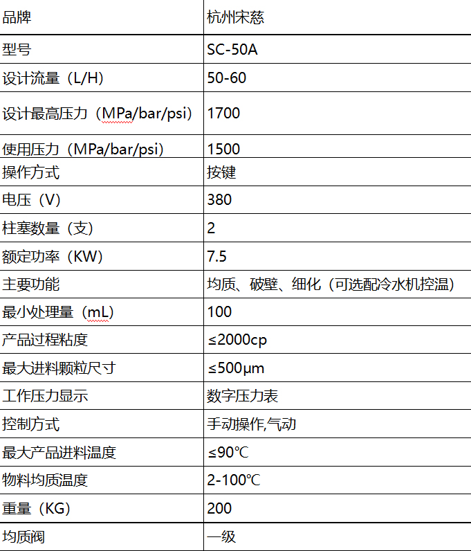 高壓均質機SC-50A均質是使懸浮液(或乳化液)體系中分散物微?;⒕鶆蚧奶幚磉^程,這種處理同時起降低分散物尺度和提高分散物分布均勻的作用。